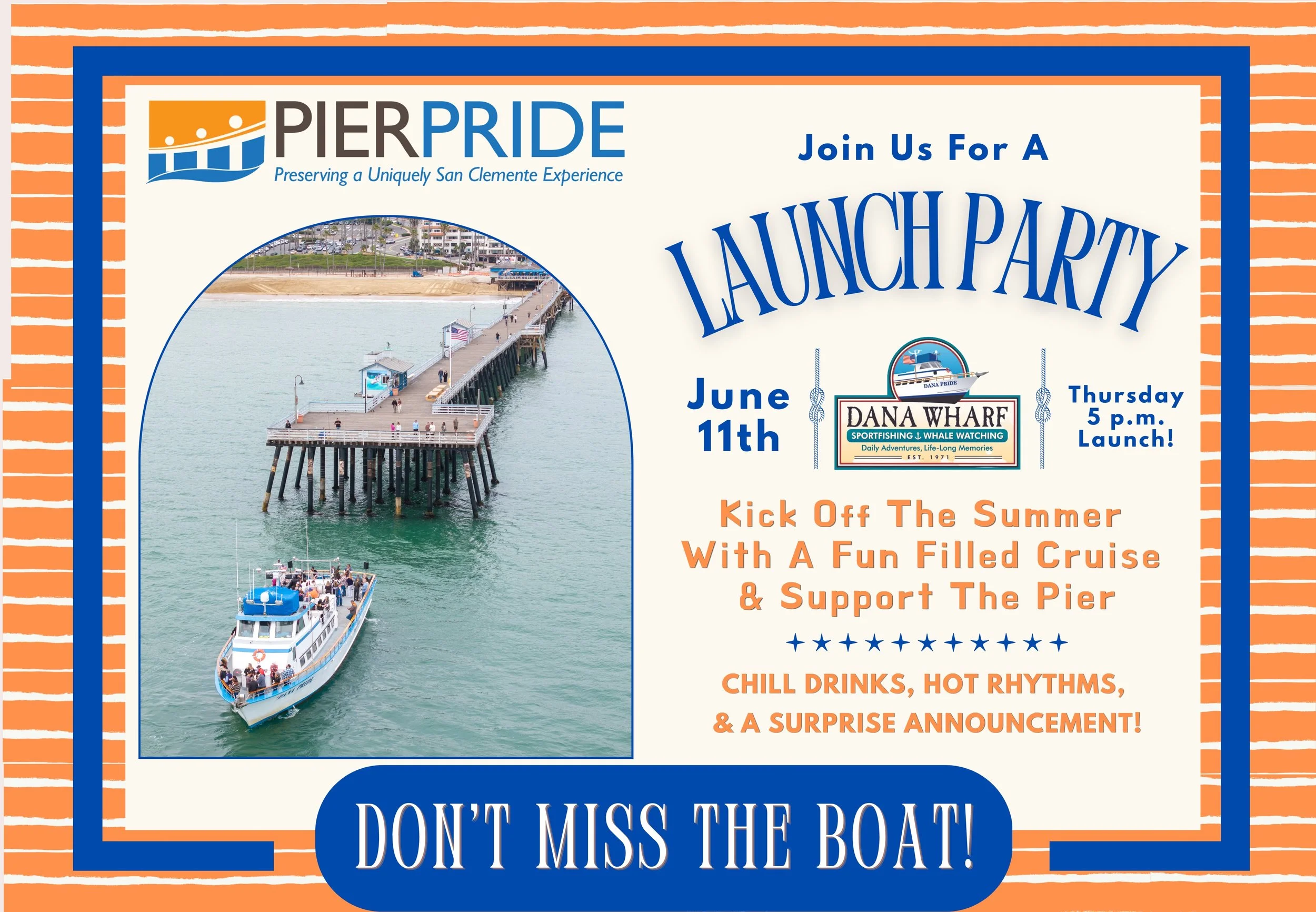 Cruise date doesn’t work for you, but you still want to give? Every dollar donated to PierPride is used to preserve and enhance San Clemente Pier, ensuring this treasured icon can be a place where future generations build memories